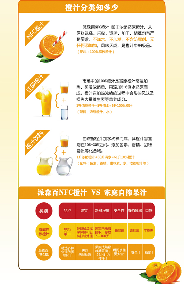 3. 优于自家单一品种压榨的橙汁,派森百集数十个优良品种,取其精华复合而成,大限度地提供了人体所需营养。